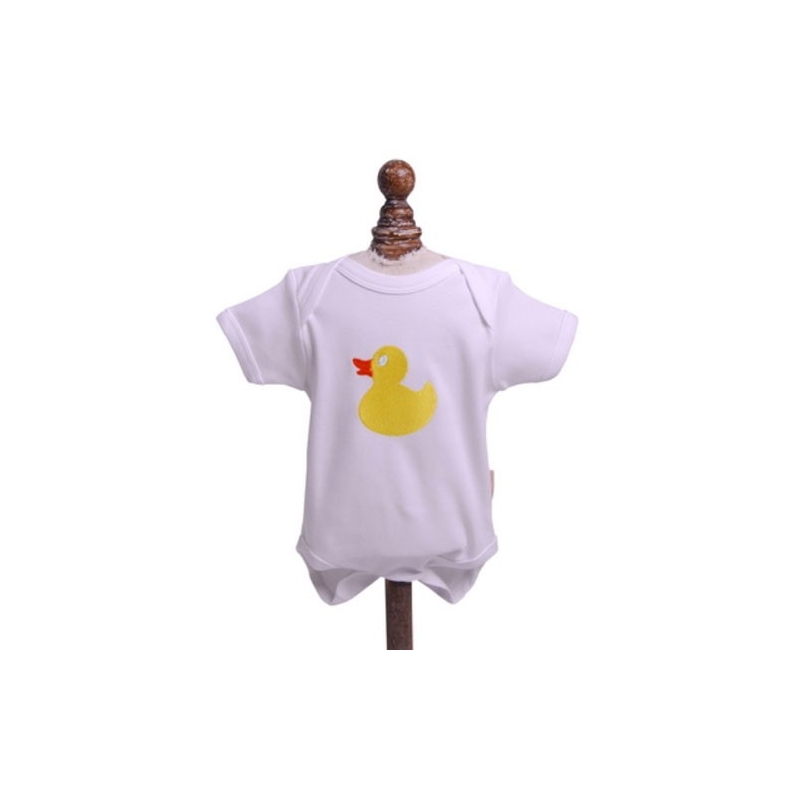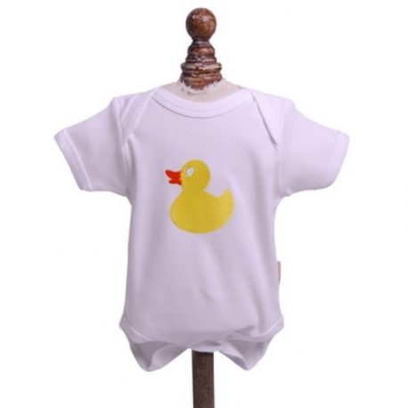 The Beauty & The Bib White Duck is the perfect summer outfit and a beautiful T-shirt when it's cold. It is made of blue cotton, with a yellow bee embroidered on the front, yellow trim, round neck, short sleeve and snap button closure.
