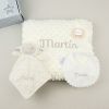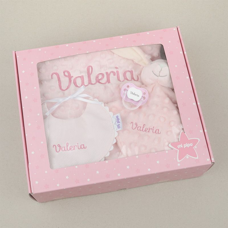 It includes: - Personalized Classic Blanket -Dou-Dou custom heads - Personalized Baby Pacifier 0m - Personalized birth bibs Piqué - Gift box (design may vary depending on availability) - Maximum 10 characters