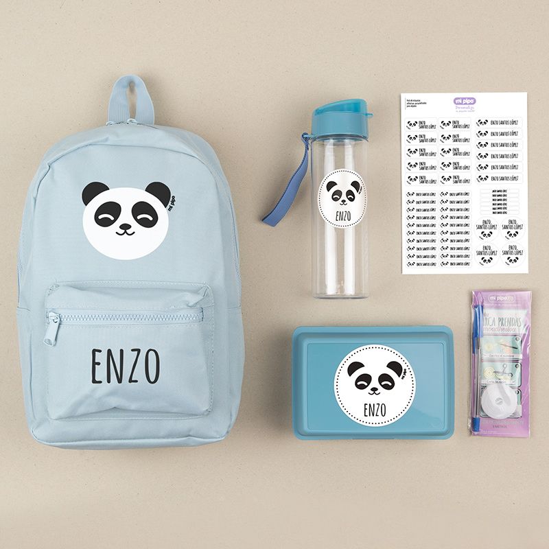Pack Mi Equipo para el Cole con Mochila Panda Azul personalizado + Regalo Marcaprendas