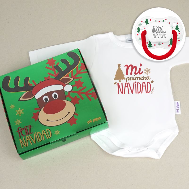 Cajita Navidad Body + Chupete New Classic Blanco Árboles Verdes Mi primera Navidad Retro