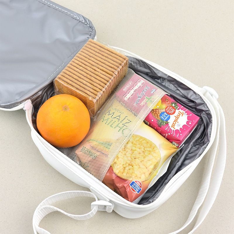 - Capacidad para bocadillo, zumo y pieza de fruta