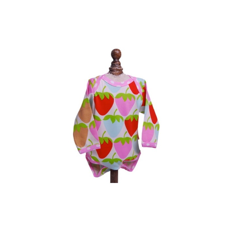 El body Strawberries multicolor de Beauty & The Bib es el atuendo perfecto para verano y una preciosa camiseta cuando hace frío. Está fabricado en algodón con un original diseño de grandes fresas de colores sobre fondo blanco, cuello redondo con ribete de lunares blancos, manga larga y cierre de botones a presión.
