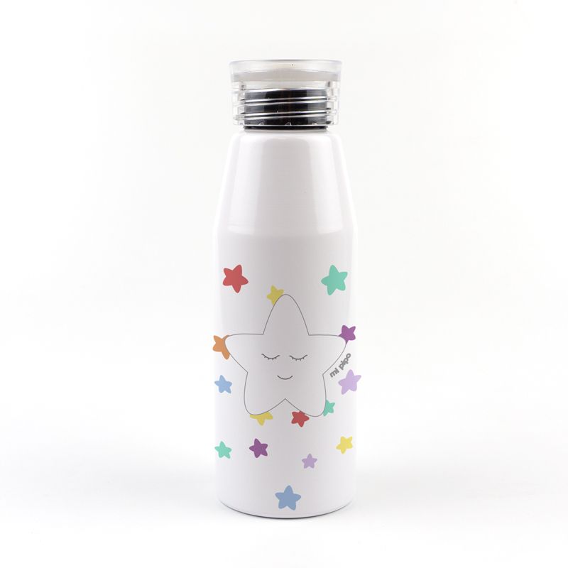 - Material: botella de alumino. El tapón incluye asa de silicona para su transporte.