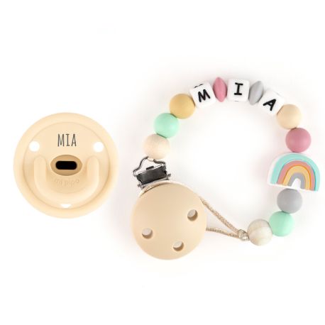 Cajita Chupete Gummy Beige + Cadenita de Silicona Arcoiris Beige personalizada