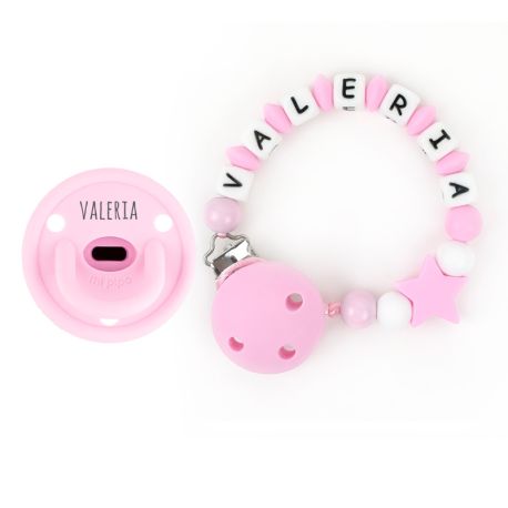Cajita Chupete Gummy Rosa + Cadenita de Silicona Estrella Rosa personalizada