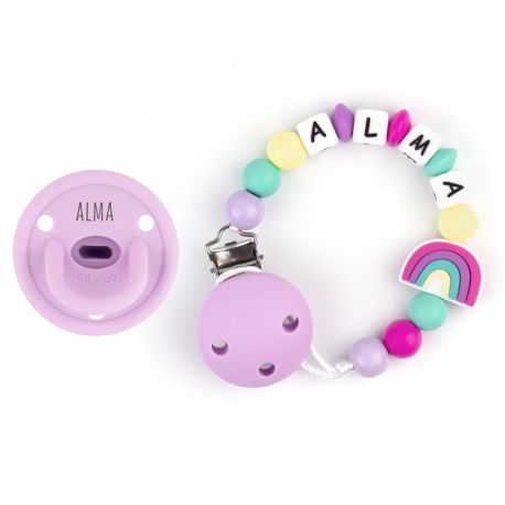 Cajita Chupete Gummy Lila + Cadenita de Silicona Arcoíris personalizada