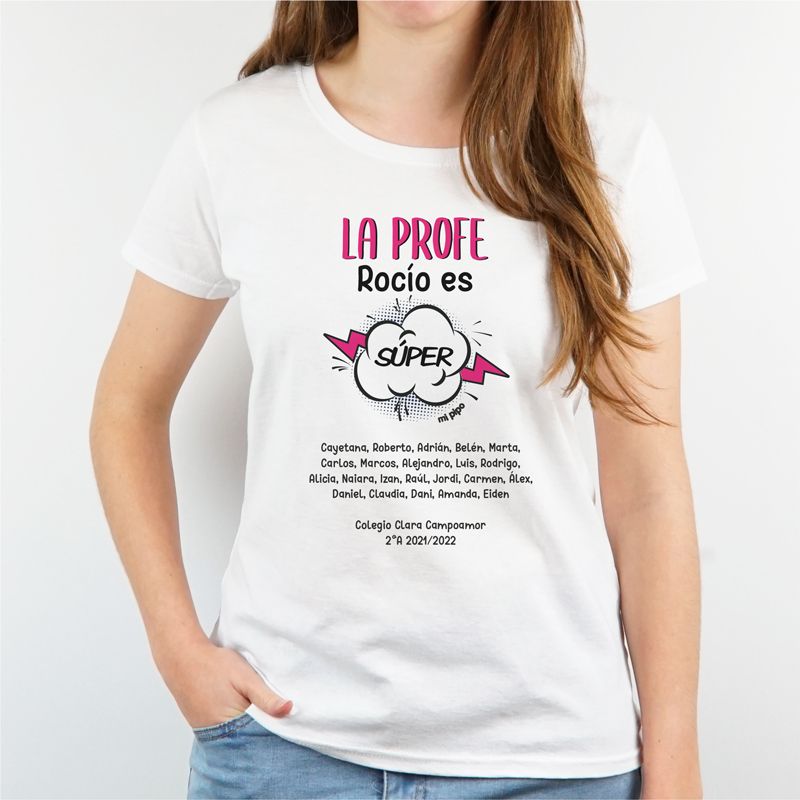 Camiseta Personalizada la Profe (nombre) es súper rosa cómic (texto alumnos)