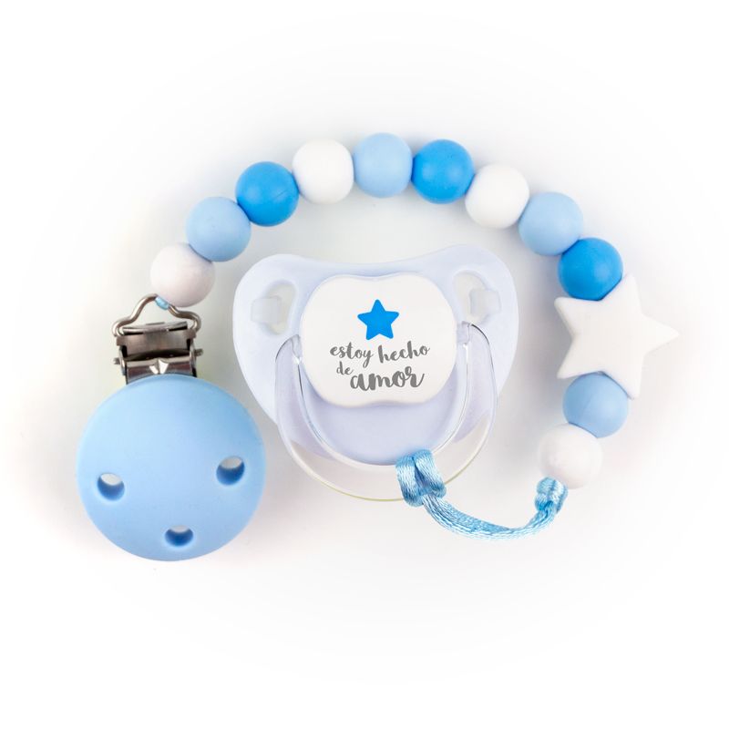 Cajita Chupete Azul pastel Divertido + Cadenita de silicona Estrella Celeste, texto a elegir