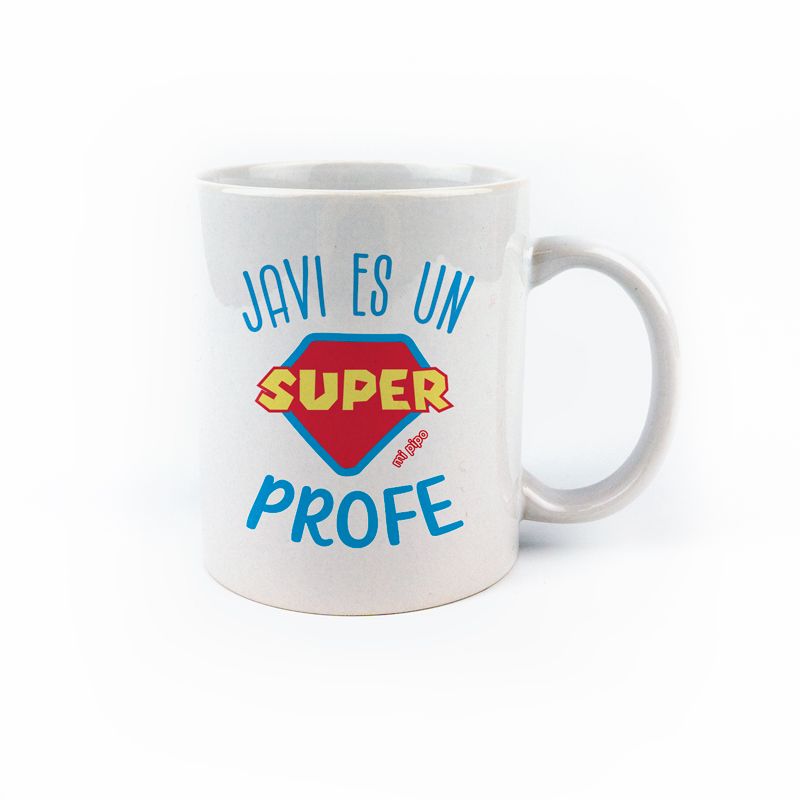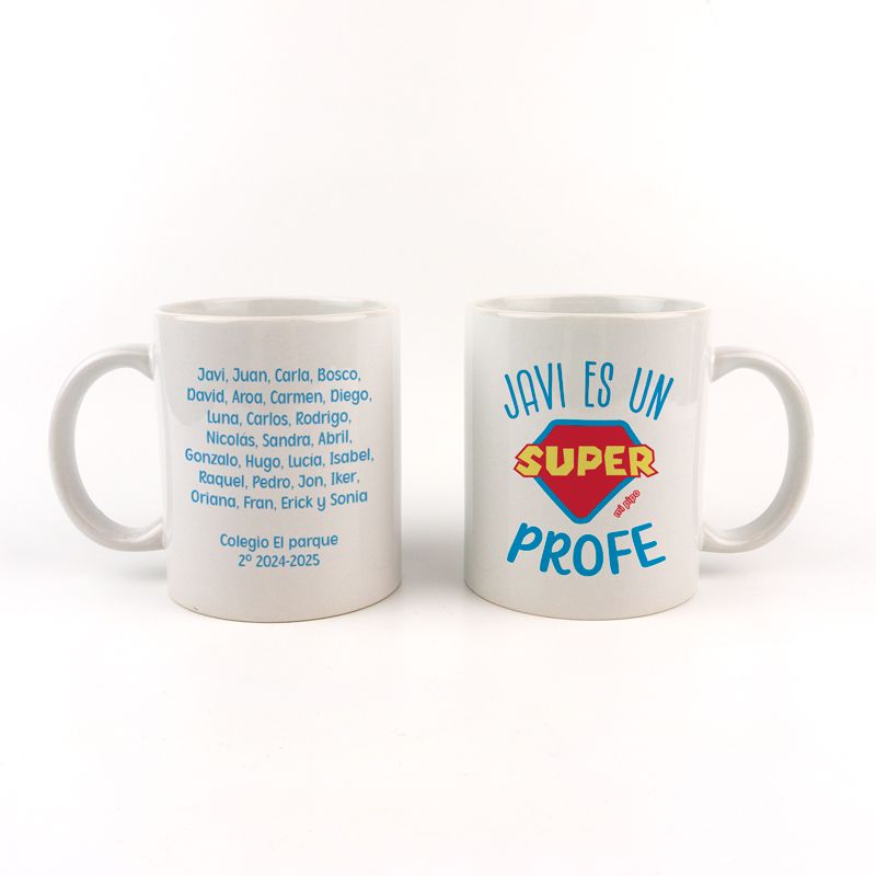 Taza cerámica o plástico (nombre) es un Súper Profe Azul + Nombres Alumnos.