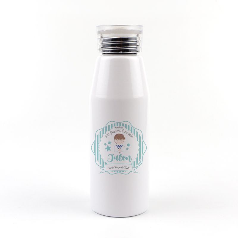 - Material: botella de alumino. El tapón incluye asa de silicona para su transporte.