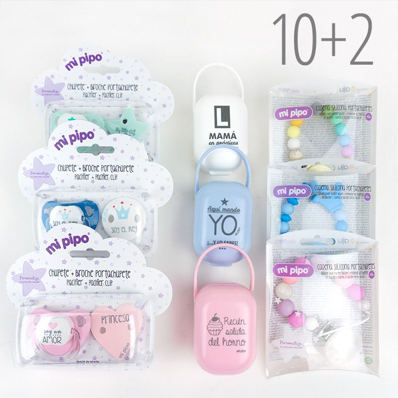 10 packs Duo (chupete + broche) divertidos + 2 de regalo