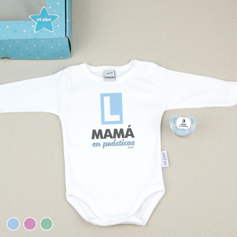 Cajita Divertida Body + Chupete Mamá en prácticas Menta, Azul o Rosa