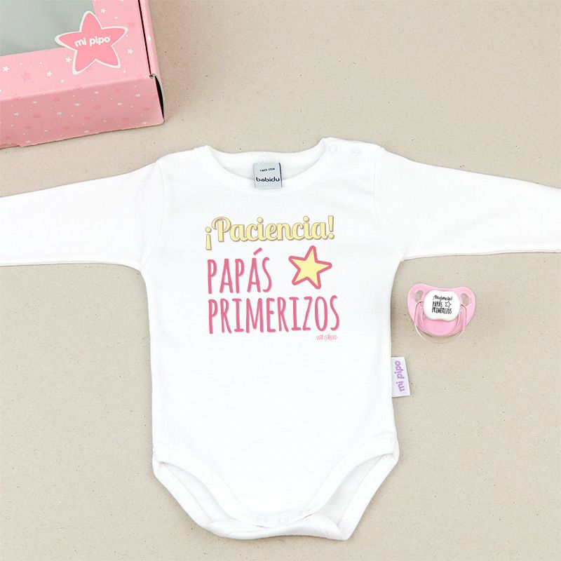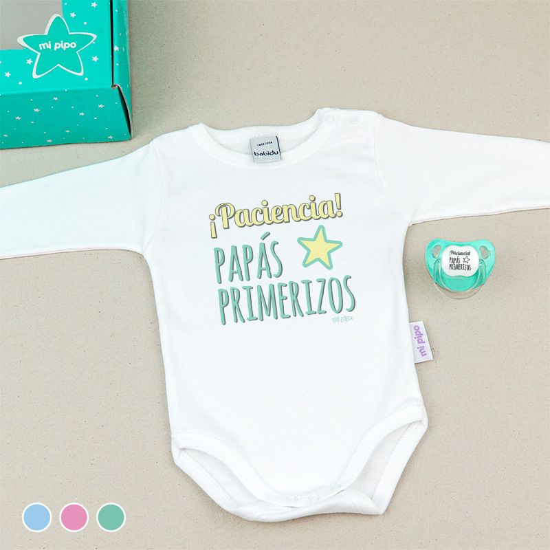 Cajita Divertida Body + Chupete ¡Paciencia! Papás primerizos Menta, Azul o Rosa