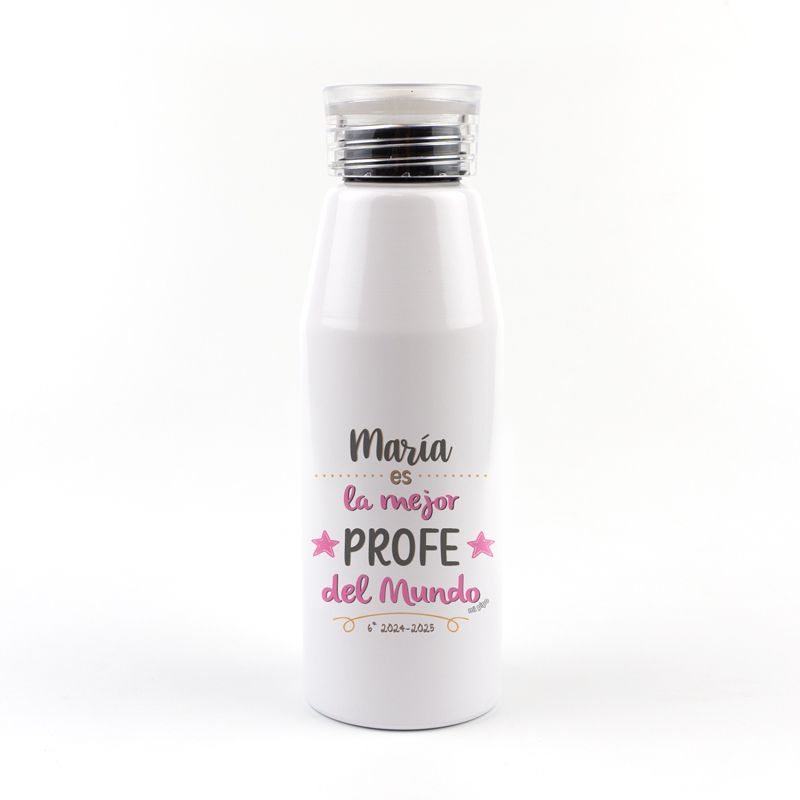 Botella Aluminio personalizada (Nombre) es la mejor PROFE del Mundo rosa