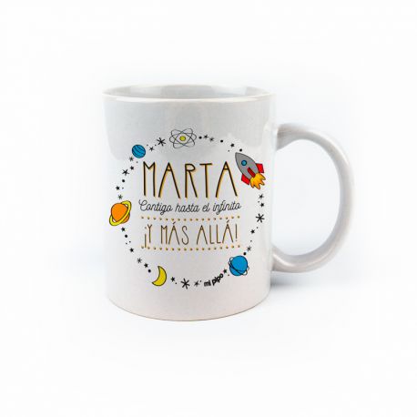 Taza cerámica o plástico (Nombre) contigo hasta el Infinito ¡y más allá! personalizada