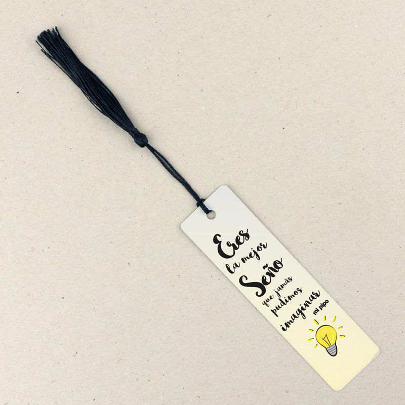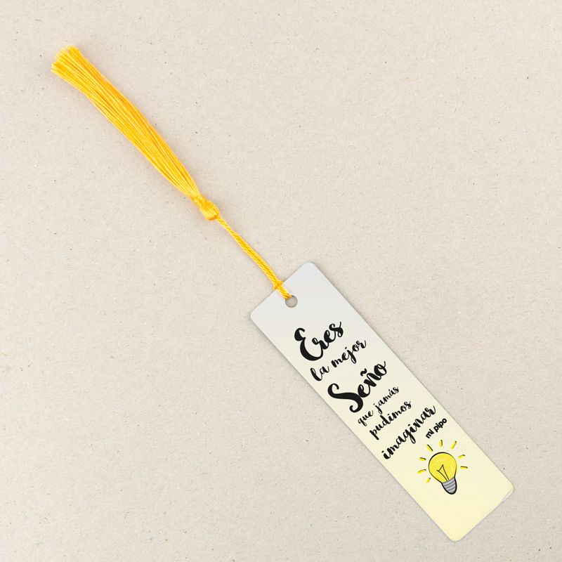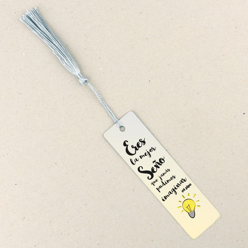 Marcapáginas de aluminio personalizado a una cara con borla en tonos variados según modelo.