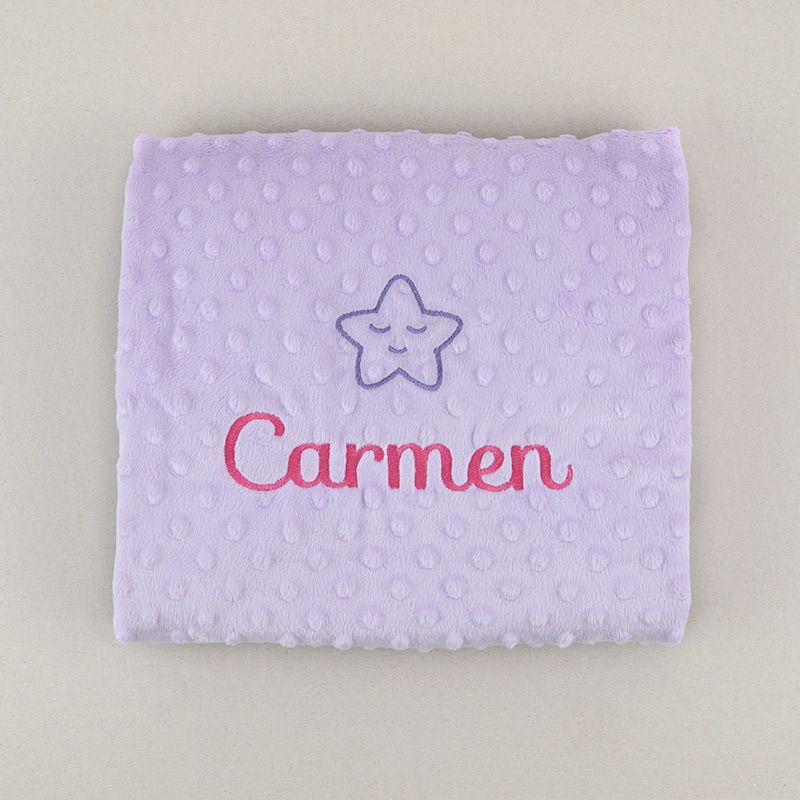 *La manta de la imagen está bordada con letra Muñeca en color Fucsia y dibujo Estrella Sonrisa en color Morado.