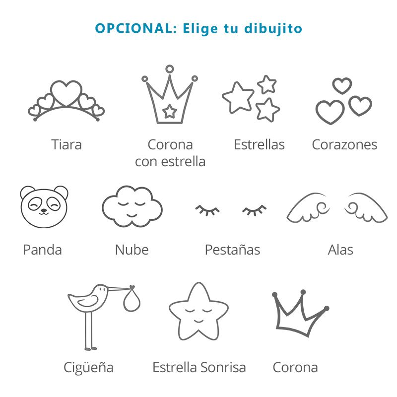 - Se puede añadir un dibujo (tiara, corona, estrellas, corazones, cigüeña, panda, nube, pestañas, alas, estrella sonrisa)