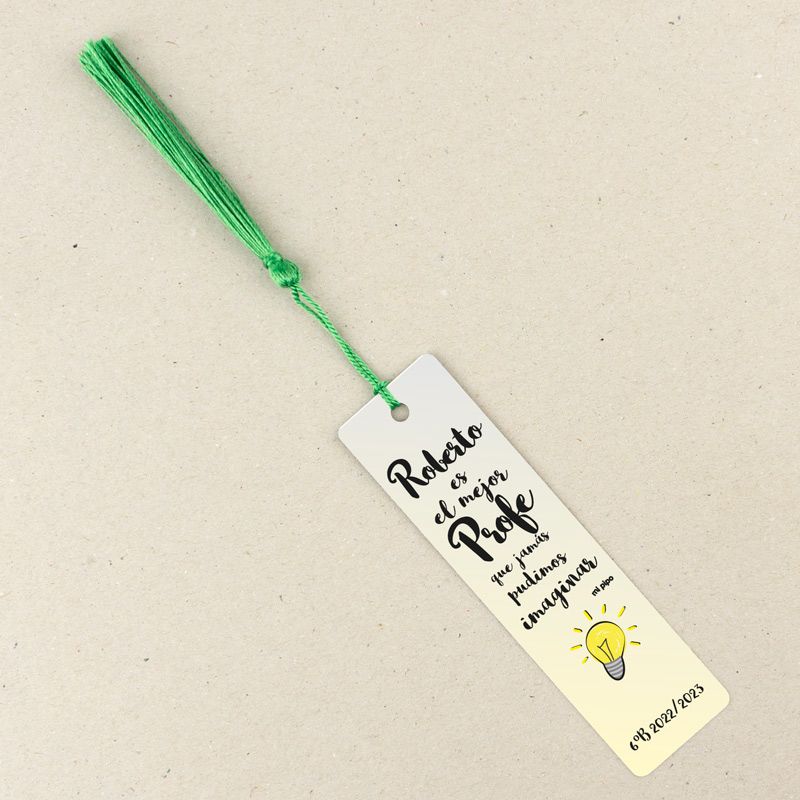 Marcapáginas de aluminio personalizado a una cara con borla en tonos variados según modelo.