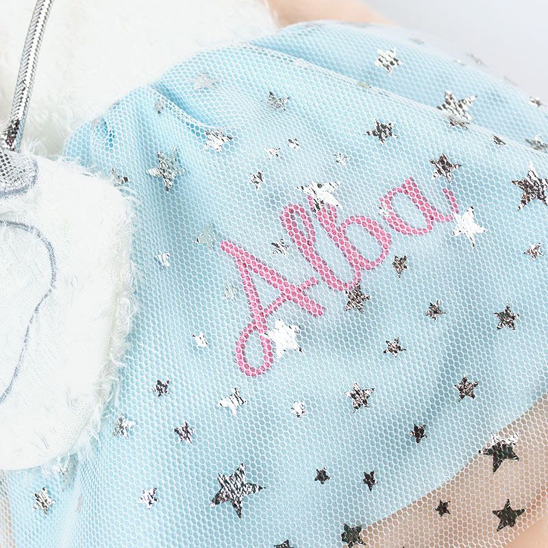 - Se personaliza el nombre bordado en la primera capa de la falda (debajo del tul) con el tipo de letra muñeca