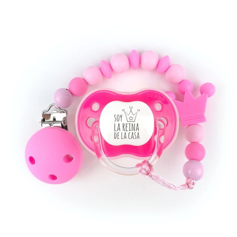 Cajita Chupete Fucsia Divertido + Cadenita de silicona Corona tonos Rosa , texto a elegir