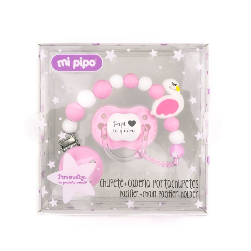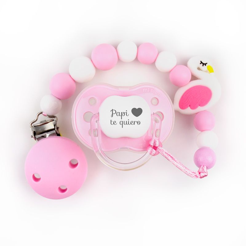 Cajita Chupete Rosa Divertido + Cadenita de silicona Cisne, texto a elegir