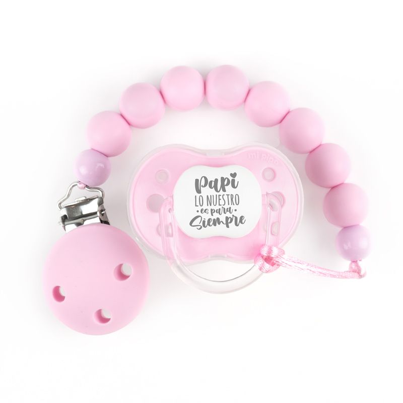 Cajita Chupete Rosa Divertido + Cadenita de silicona Bubble Rosa, texto a elegir