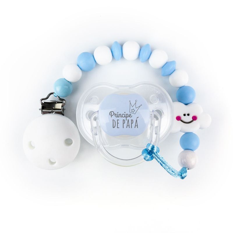 Cajita Chupete Azul Cristal Divertido + Cadenita de silicona Nube Azul, texto a elegir