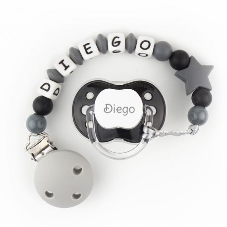 Cajita Chupete Negro + Cadenita de silicona Estrella gris personalizados