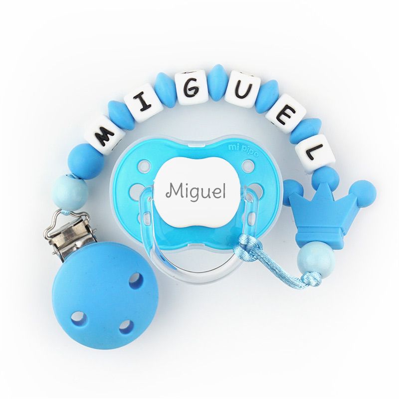 Cajita Chupete Pitufo + Cadenita de silicona Corona tonos azules personalizados