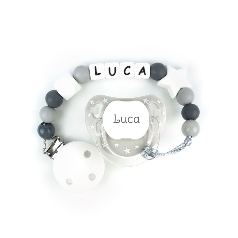 Cajita Chupete Chic Gris+ Cadenita de silicona Baby Gris personalizada