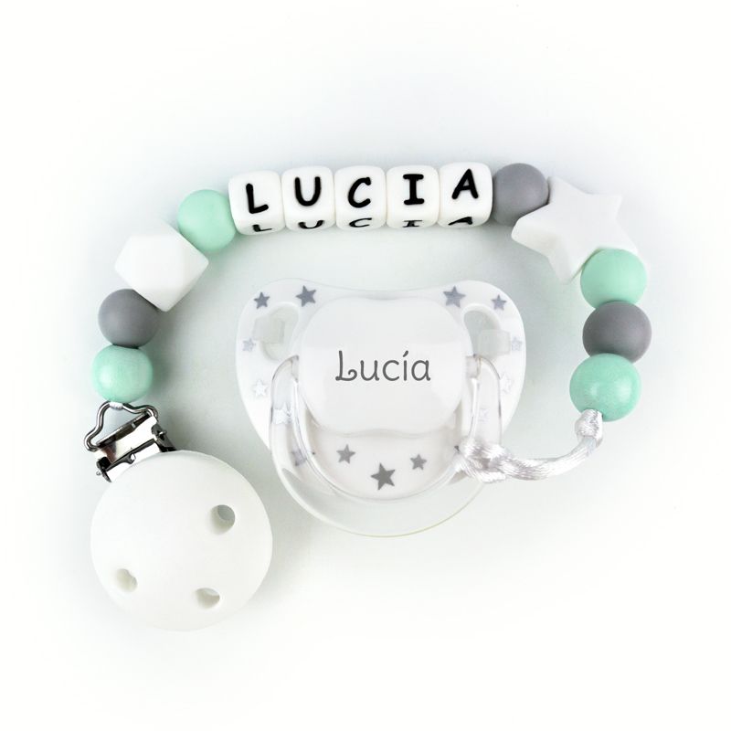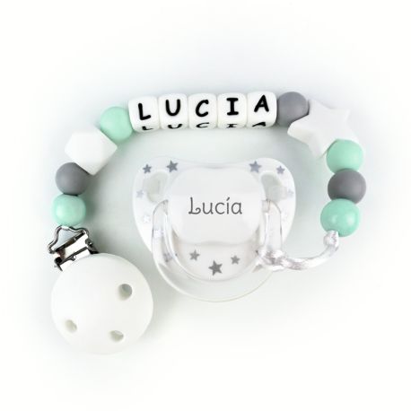 Cajita Chupete Chic Blanco Plata + Cadenita de silicona Baby Menta personalizada