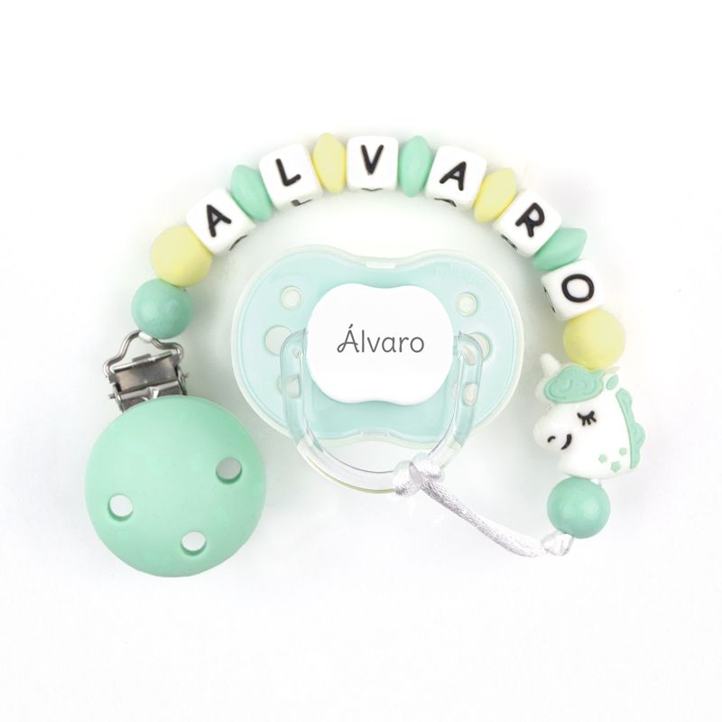 Cajita Chupete Menta + Cadenita de silicona Unicornio Menta personalizada