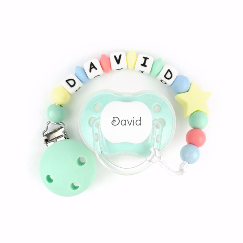Cajita Chupete Menta + Cadenita de silicona Estrella Multicolor personalizada