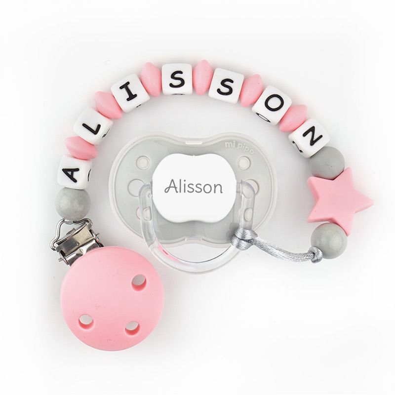 Cajita Chupete Gris + Cadenita de silicona Estrella salmón personalizados