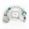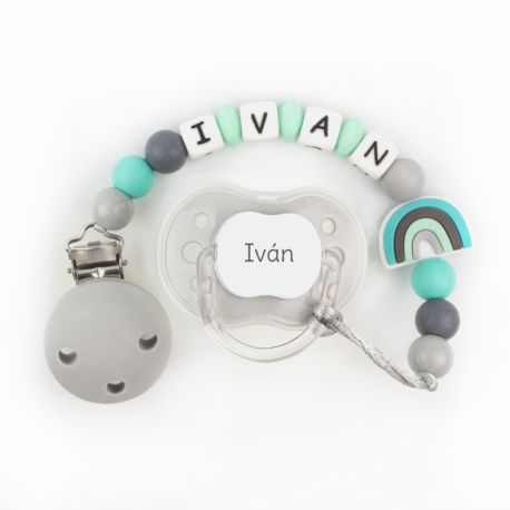 Cajita Chupete Gris + Cadenita de silicona Arcoíris Gris personalizada