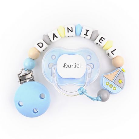 Cajita Chupete Celeste + Cadenita de silicona Barquito Celeste personalizada