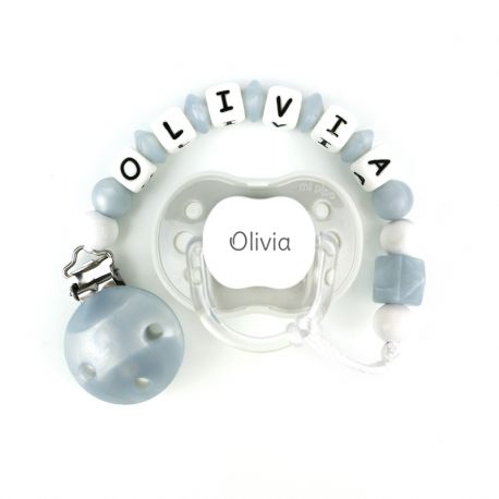 Cajita Chupete Gris + Cadenita de silicona Gris Nácar personalizada