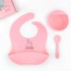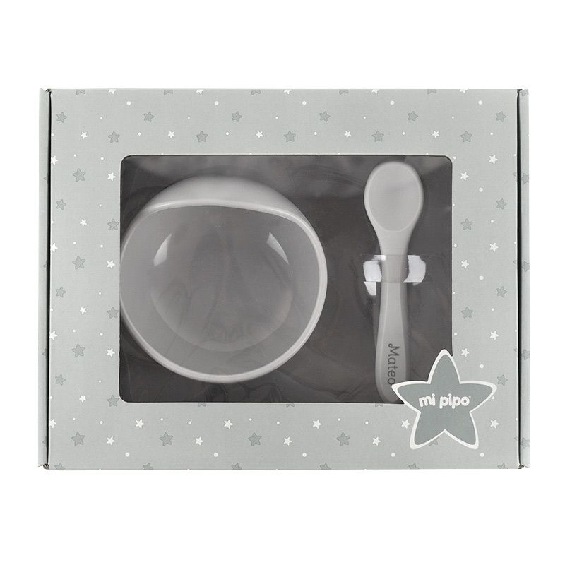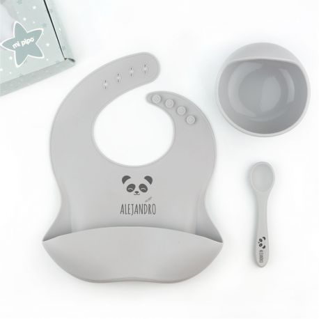 Vajilla con babero, bol y cuchara de silicona Personalizada Gris, dibujo a elegir