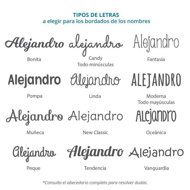 - Puedes elegir el color del bordado del nombre. El color del bordado del aplique se hará acorde a los colores de la manta y del dibujo