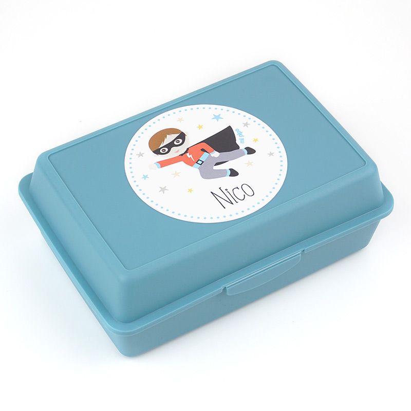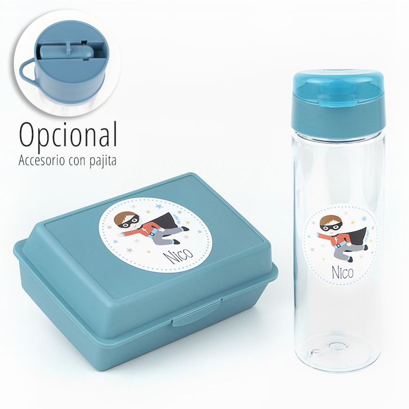 Pack Botella 600ml + Cajita Porta Alimentos Superhéroe Azul personalizadas