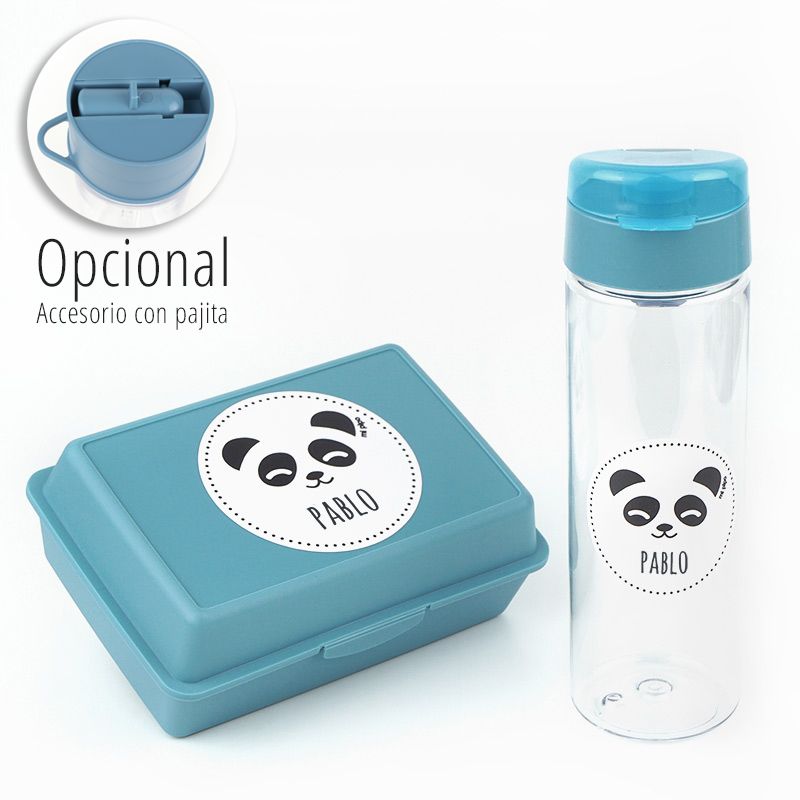 Pack Botella 600ml + Cajita Porta Alimentos Panda Azul personalizadas