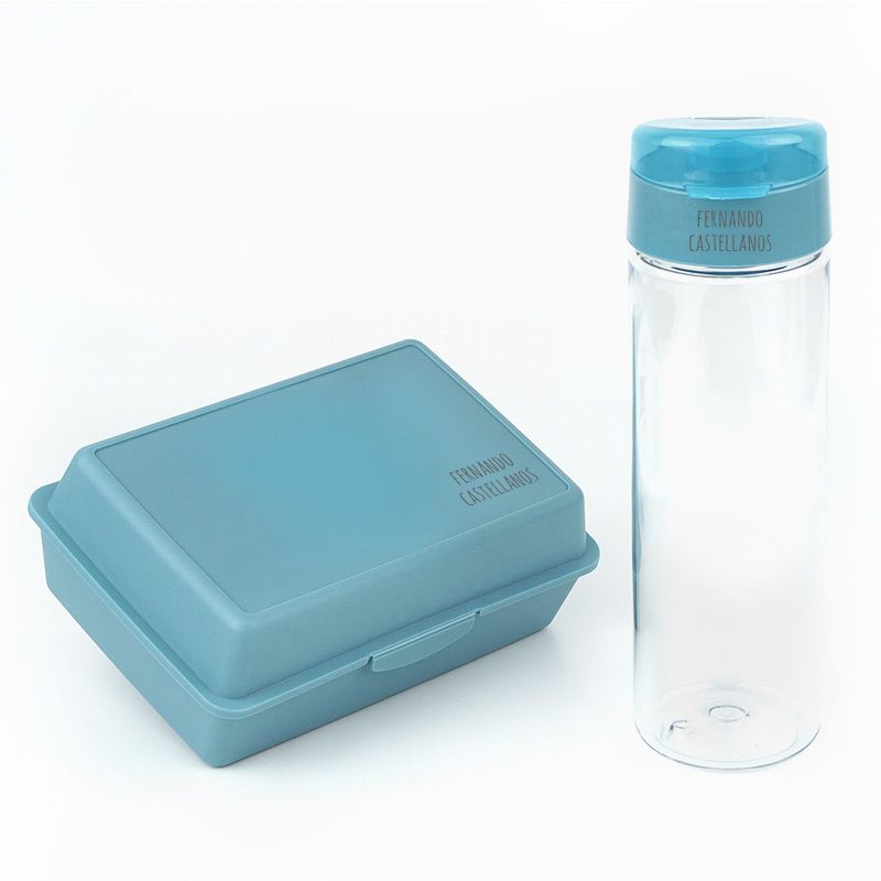 Pack Botella 600ml + Cajita Porta Alimentos Azul personalizadas