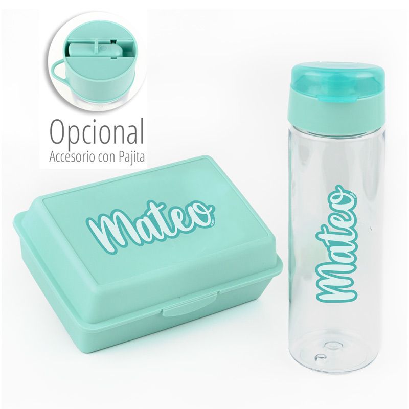 Pack Botella 600ml + Cajita Porta Alimentos Caligrafía Menta personalizadas