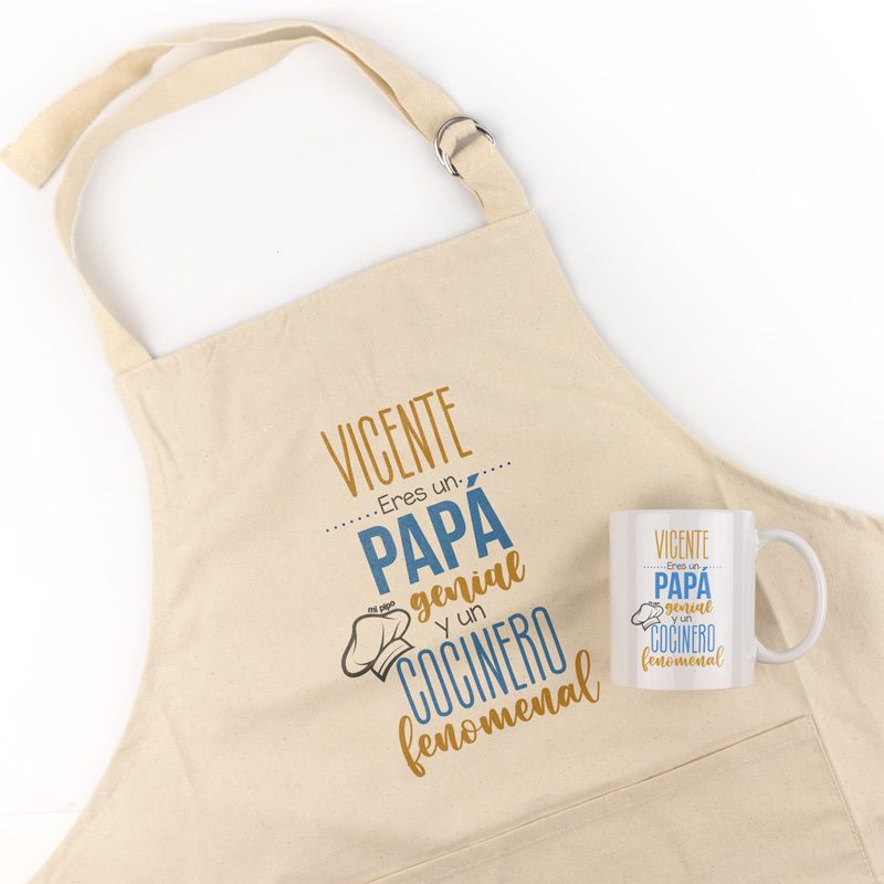 Pack Delantal Papá + Taza (Nombre) Es un Papá genial y un Cocinero Fenomenal