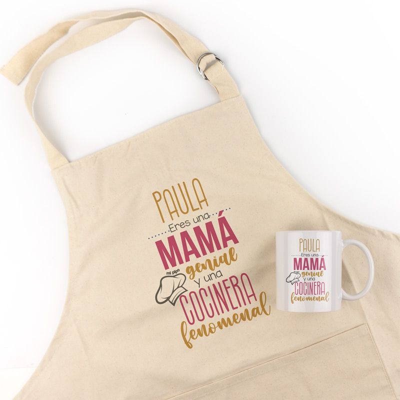Pack Delantal Mamá + Taza (Nombre) Es una Mamá genial y una Cocinera Fenomenal