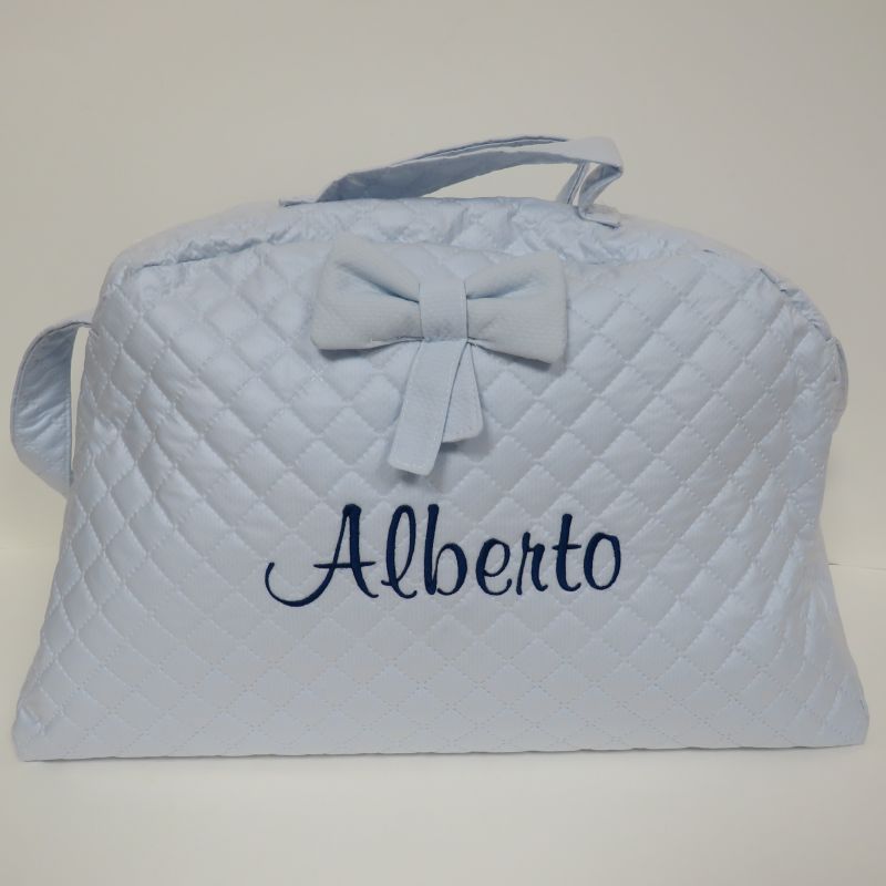 - Bolso celeste personalizado con nombre Alberto, bordado en marino
