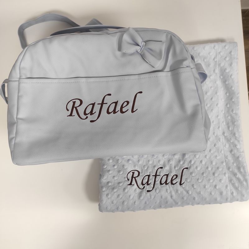 - Bolso maleta poilipiel basic celeste bordado en chocolate y letra caligráfica