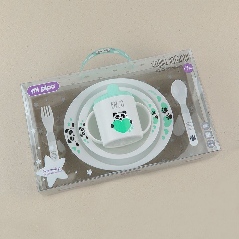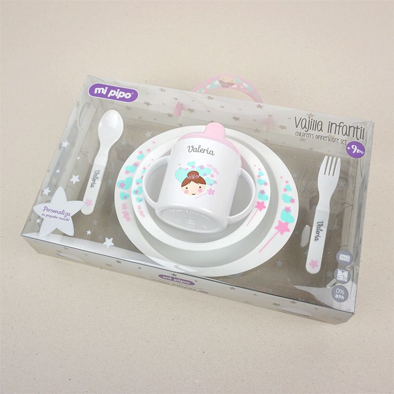 - Vajilla 5 piezas: taza con tapa y asas, plato llano, bol, cuchara y tenedor