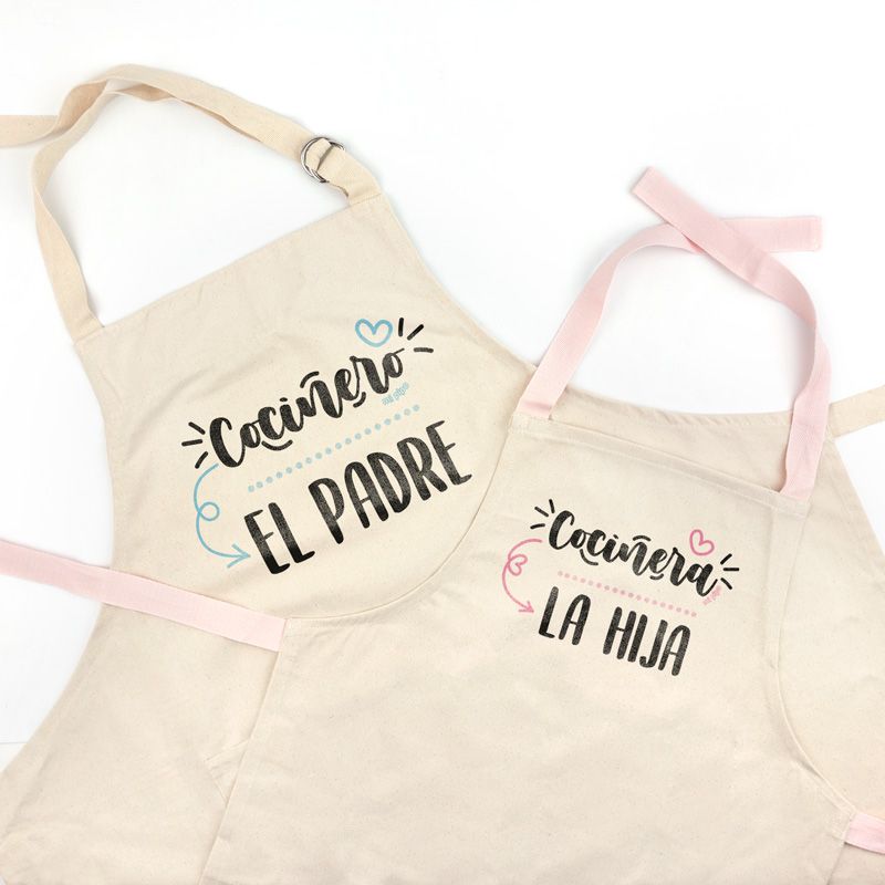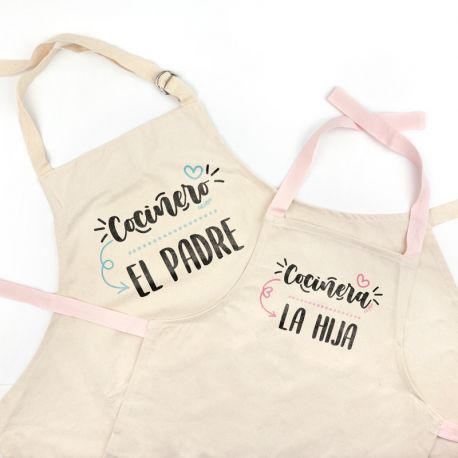 Pack Delantal Papá y Delantal Niño/a Rosa Diverrtido Cocinero el padre, cocinera la hija